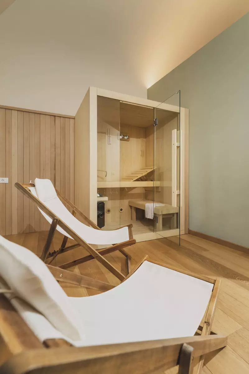 Questo spazio accogliente ospita un divano, perfetto per rilassarsi durante il giorno, e all’occorrenza trasformabile in un letto alla francese, ideale per una terza persona o due bambini.