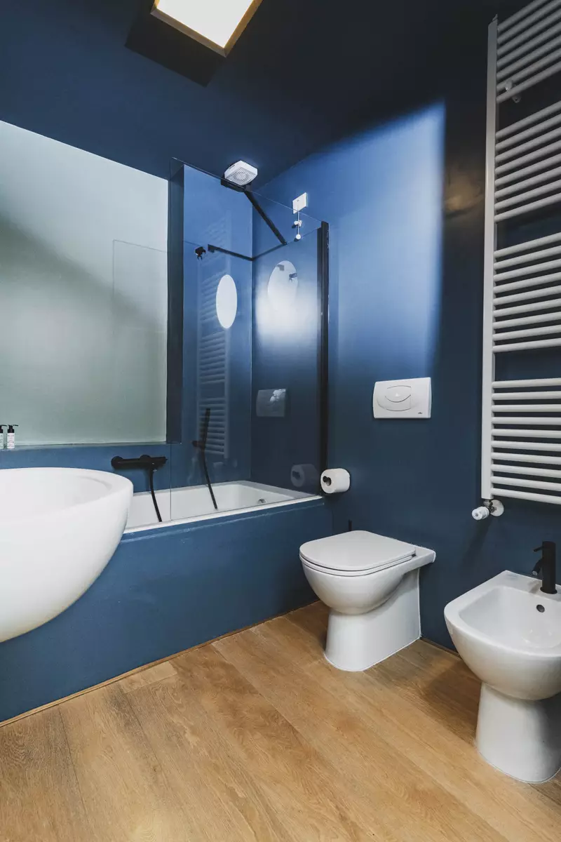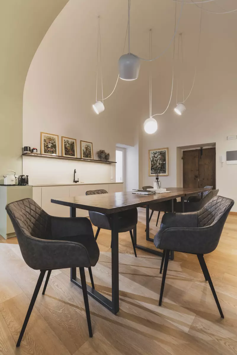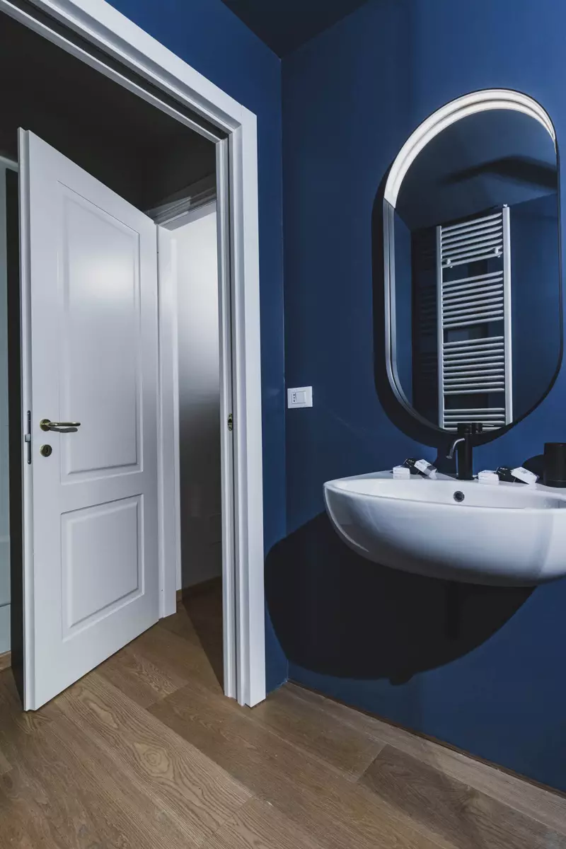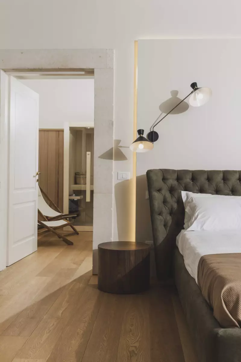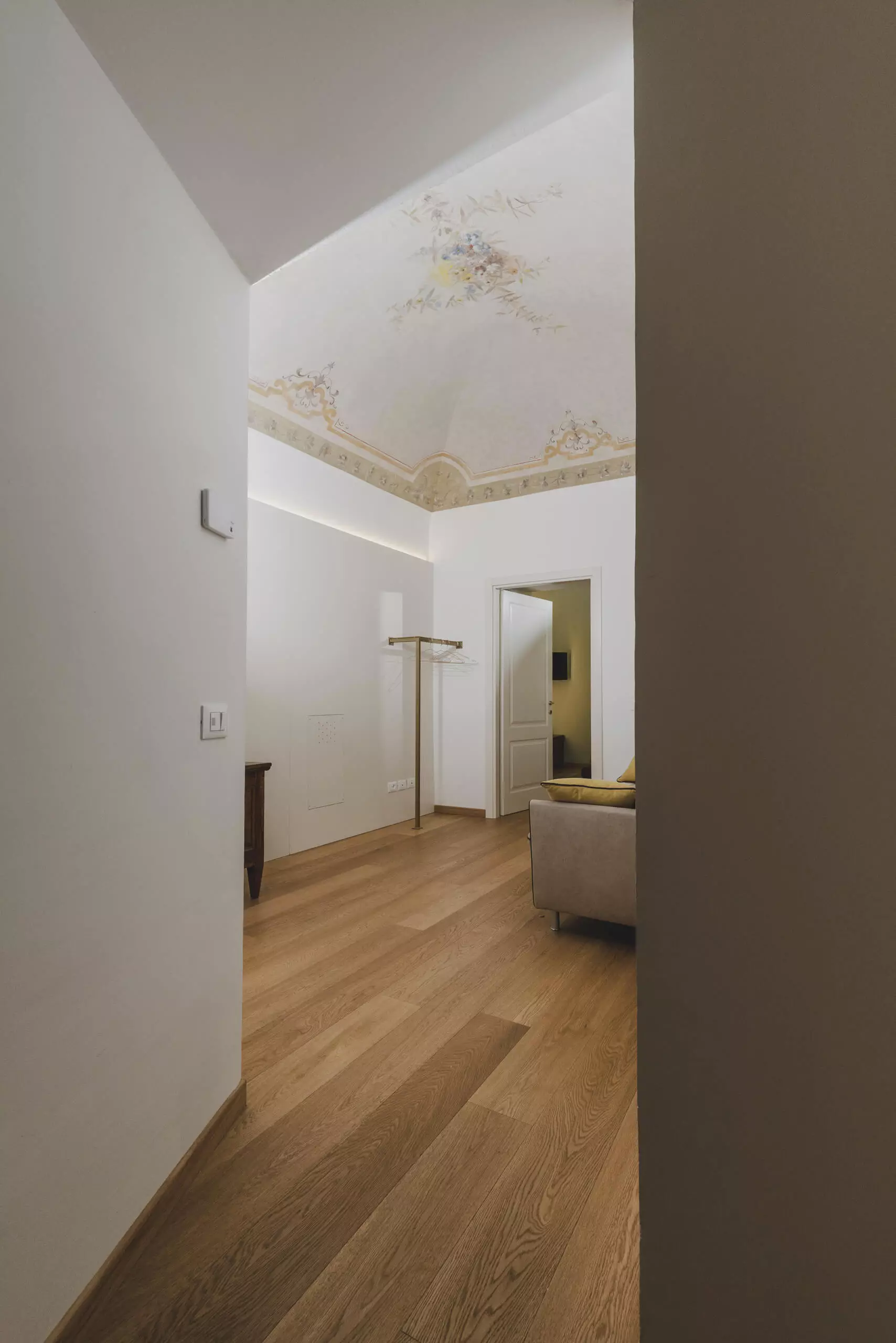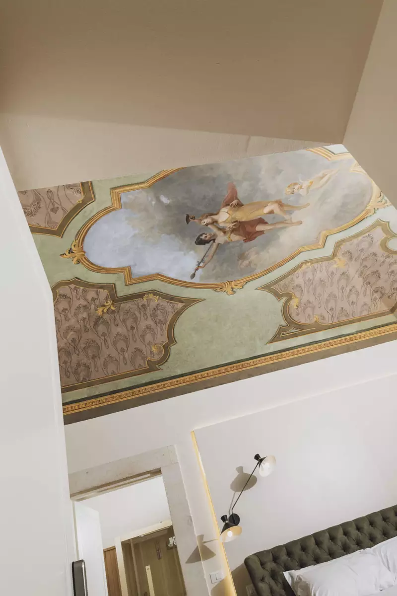 Una suite di 40 mq che unisce eleganza, comfort e dettagli artistici unici. Il protagonista è un suggestivo quadro di aironi, simbolo di armonia e leggerezza, accompagnato da un affresco ottocentesco restaurato con motivi floreali che decora il soffitto della zona living.