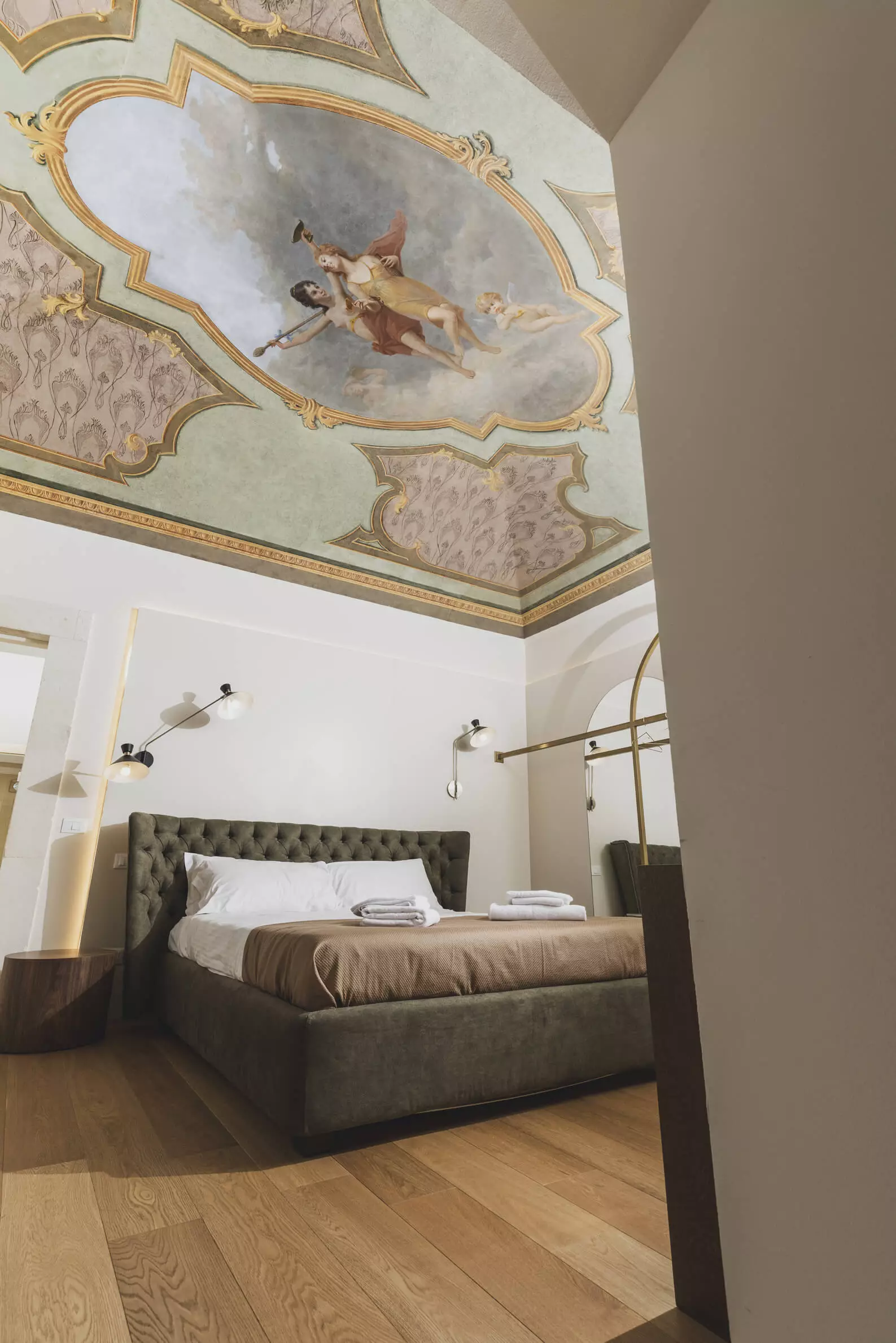 Un’elegante suite di 40 mq che unisce comfort contemporaneo e bellezza storica. Il cuore dello spazio è il soffitto, dove troneggia un affresco ottocentesco finemente restaurato, raffigurante una scena mitologica in cui figure celesti e giochi di luce donano profondità e poesia all’ambiente. Il recupero dell’opera è stato eseguito con grande cura, riportando alla luce i colori originali e restituendo all’ambiente il fascino autentico di un tempo.